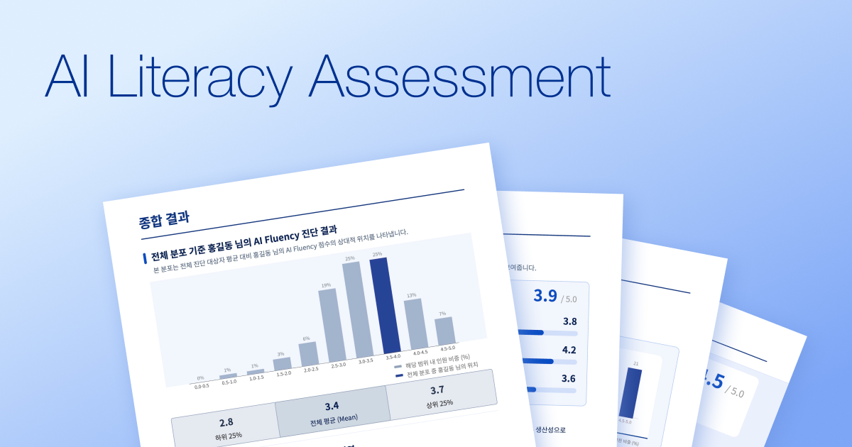 진단 결과는 참여 인원 규모와 상관없이 모든 응답자에게 개인별 리포트 형태로 제공된다. 조직은 개인의 스킬 수준뿐 아니라 조직 전체의 AI 준비 수준과 취약 영역을 한눈에 파악할 수 있으며, 이를 기반으로 교육 설계, 역할 재정의, AI 거버넌스 구축 등 후속 실행 전략으로 연결할 수 있다.