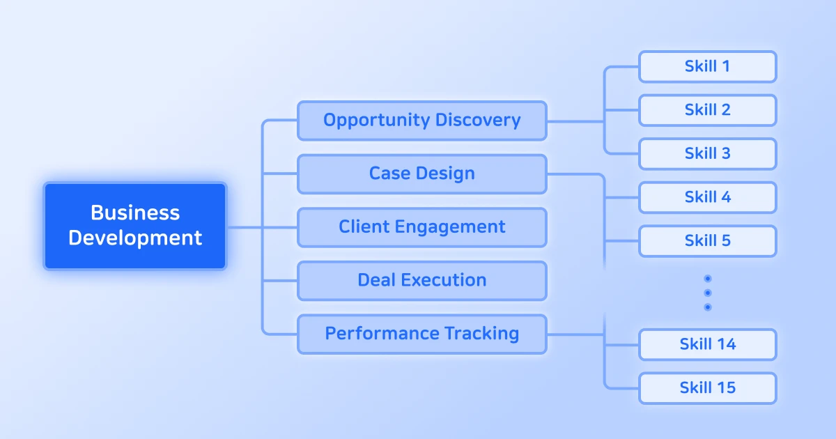 우리는 AI를 활용해, B2B업종 각 분야의 글로벌 선도기업 200여 곳을 선정하고, 각각의 포지션에서 요구하는 과업과 스킬을 정밀하게 분석했습니다. 특정 산업에 치우지지 않고, B2B 비즈니스 환경이라면 어디서든 통용되는 BD의 공통 과업(Task) 다섯 가지를 추출했죠. 이를 통해 “우리 팀에 필요한 기준”을 넘어, 시장에서 검증된 표준 역량 체계를 구축할 수 있었습니다.
